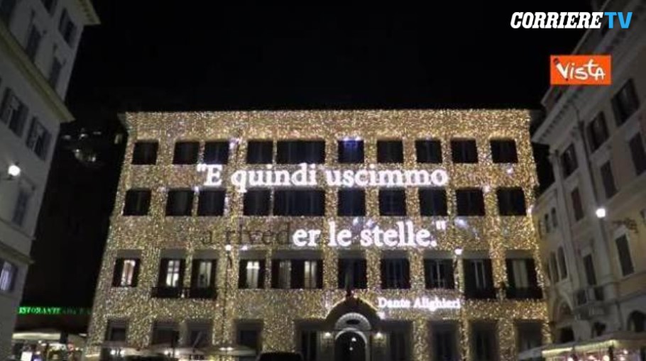 Und zu guter Letzt, weil es so schön passt, noch ein Bild vom Dezember in Rom, wo die Piazza di Spagna mit Lichtern und einem hoffnungsvollen Zitat ‒ von Dante, wem denn sonst ‒ geschmückt ist. Es ist der letzte Vers vom Inferno, der Schritt aus der Hölle.