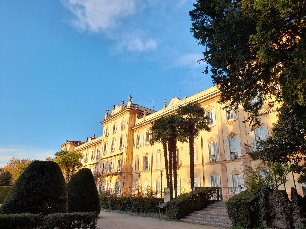 Erwartungsvoll sitze ich im Zug und genieße den Blick von der Eisenbahnbrücke auf unseren kleinen Ort, der sich in der nachmittäglichen Sonne von seiner romantischsten Seite zeigt. In Varese habe ich über eine halbe Stunde Zeit bis zum Veranstaltungsbeginn, folge der Verlockung eines offenstehenden Tores und betrete eine Parkanlage, in deren Zentrum ich staunend vor dem ehemaligen Grand Hotel Excelsior stehe. Wow! Dafür, dass es seine Glanzzeiten als Luxusabsteige vor über hundert Jahren hatte und schon seit den dreißiger Jahren des vergangenen Jahrhunderts in öffentlicher Hand ist (als Sitz der Provinzverwaltung und Präfektur), macht es eine prächtige Figur, findet ihr nicht? Wie hatte mir mein Mann, gebürtiger Varesiner, dieses touristische Kleinod all die Jahre vorenthalten können? (Er kannte es nicht oder war sich zumindest nicht bewusst, dass es ein ehemaliges Hotel und so schön anzuschauen ist.) Während ich die überraschende Entdeckung genieße und durch den dazugehörigen Park bummele, stelle ich fest, dass ich mittlerweile die einzige Spaziergängerin bin. Auch die hellen Kinderstimmen sind nicht mehr zu vernehmen, die ich kurz zuvor noch als beruhigendes Hintergrundgeräusch registriert hatte. Mir kommt in den Sinn, dass es – dem schönen Wetter zum Trotz, aber jahreszeitgemäβ – womöglich recht frühe Schlieβzeiten gibt und gehe in die Richtung, aus der ich glaube, gekommen zu sein. Mein Herz gerät aus dem Takt, als ich vor einem verschlossenen Tor stehe. Der Blick auf die Beschilderung lässt ausgerechnet die Öffnungszeiten im Ungewissen, sie sind fein säuberlich (für mich?) unkenntlich gemacht. Ich wähne mich schon bei „Versteckte Kamera“, bin ich mir doch sicher, hier vor kaum fünfzehn Minuten hindurchgegangen zu sein.