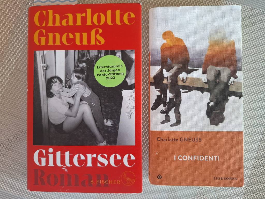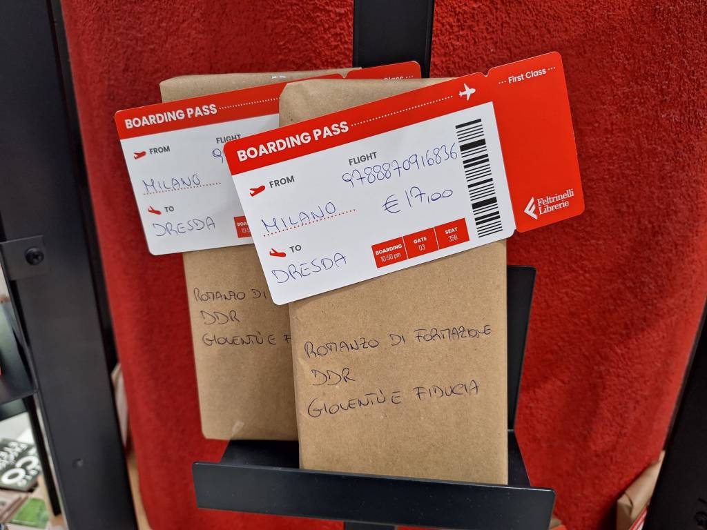 Anfang August, Flughafen Mailand Malpensa. Meine Tochter und ich vertreiben uns die Wartezeit auf unseren Flug Mailand – München – Dresden in der Buchhandlung. Wie immer entdecke ich fünf oder zehn Titel, die ich mir sofort kaufen würde. Kann man das? Nein. Schon gar nicht mit Handgepäck auf dem Weg zum Boarding. Wieder wird es so sein, dass ich statt zehn Büchern gar keins kaufe, denn die Entscheidung für eines fällt schwer. Da bleibt mein Blick an einem ungewöhnlich dekorierten Regal hängen. Die Bücher sind mit Packpapier verhüllt, drei, vier handgeschriebene Worte sollen Hinweise auf den Inhalt geben. Obenauf jeweils eine fiktive Boardingkarte. Die Erklärung dazu gibt eine Tafel: „Libri al buio, accetti il rischio?“ (Bücher blind kaufen, akzeptierst du das Risiko?). Puh! Riskante Aktion, zumal ich sehe, dass es keine Schnäppchenpreise sind, die man für ein Überraschungsbuch bezahlt. Einen Augenblick später rufe ich aufgeregt meine Tochter hinzu. Es gibt ein Buch für den Flug Mailand – Dresden (wie schön wäre eine Direktverbindung), und die Stichworte lauten:  Romanzo di formazione (Bildungsroman), DDR (was war das gleich?), Gioventù e fiducia (Jugend und Vertrauen). Einen Moment lang sorge ich mich, das Buch bereits zu besitzen oder gelesen zu haben, doch dann schließe ich das instinktiv aus und greife zu. Das Cover und der italienische Titel (I confidenti* – Die Vertrauten) sagen mir nichts, aber Charlotte Gneuβ, von der habe ich gehört. Der Klappentext bestätigt meine Vermutung: Gittersee*, so der Originaltitel. Das ist der Stadtteil Dresdens, in dem meine Schwester jetzt wohnt und wo wir sie besuchen würden. Dieses Buch hatte einfach zu mir gemusst, auf dieser Reise.